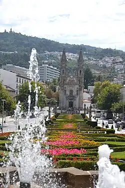 In front of the church are three rectangular gardens filled with flowers and bushes that are changed periodically to match the current season.[9] These gardens are surrounded by Portuguese pavement and subsequently by roads. Forty days before Easter, purple banners are put in the border of the gardens to mark the Lent, once Easter is over, they are removed.[10][11] The garden farthest from the church, previously a roundabout,[12] features a stone fountain at its front and the garden closest to the church features four granite statues, one at each corner, with the two statues farthest from the church having small fountains incorporated in their pedestal.[13]