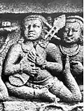 Depictions of sapeh exist in carvings and bas-relief panels found in ancient temples of Java dating back to the early 8th century. According to native Kalimantan manuscripts and inscriptions (mainly found in Banjar and Kutai Kertanegara), these string-based musical instrument originated in the eastern region of the island of Java and were introduced to the southern and eastern coastal regions of Kalimantan along with the Gamelan (percussion instruments) during the expansion of power of Singhasari kingdom (which later developed as Majapahit empire) in circa 12th to 13th century. Some notable manuscripts include the Nan Sarunai Usak Jawa (lit. 'Javanese power over Nan Sarunai') and Salasilah Kutai (lit. 'Genealogy of Kutai').[11][12] The etymological origin of Dayak sapeh, sapeʼ, sapek, sapeik, sapeq, sampeh, sampeʼ, sampek, or sampeq could be derived from Old Javanese sampe,[13] which literally means "contempt", "scorn", "scornful treatment", or "disrespect",[13] corresponding to the historical events as recorded in the Nan Sarunai Usak Jawa.[12]