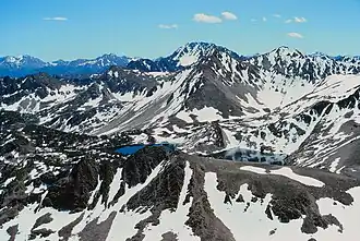 Sapphire Lake is east of D. O. Lee Peak in the Big Boulder Lakes Basin along with Cove, Hook, and Cirque Lakes.