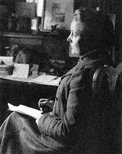 Jewett and Fields socialized with other women in "Boston marriages."[20] Both women "found friendship, humor, and literary encouragement" in one another's company, traveling to Europe together and hosting "American and European literati."[9] In Boston, the two were part of a social circle which included Willa Cather, Sarah W. Whitman, and Alice James, among others.[23] In France Jewett met Thérèse Blanc-Bentzon with whom she had long corresponded and who translated some of her stories for publication in France.[24] Jewett's poetry, much of it unpublished, includes approximately thirty love poems or fragments of poems written to women which illustrate the intensity of her feelings toward them.[19] Jewett also wrote about romantic attachments between women in her novel Deephaven (1877), which described her relationship with Annie Adams Fields, and in her short story "Martha's Lady" (1897).[20][25]