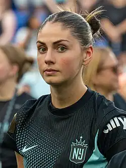 She featured all over the front line and midfielder in her junior season in 2023, recording 11 goals and 14 assists in 24 games.[2][6] She was selected to the All-ACC first team, becoming the first Panther to be so honored.[7] She helped lead the Panthers to their first ACC tournament semifinal and NCAA tournament quarterfinal appearances, both times losing to Florida State.[6][8] She played for USL W League side Racing Louisville FC the following summer.[9] In her senior season in 2024, she scored 7 goals and led the nation with 15 assists in 18 games, earning second-team All-ACC honors. Pittsburgh narrowly missed selection to the NCAA tournament.[2][10][11]