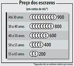 The sanctioned text provided for the release of slaves who were over 60 years of age, but not without imposing conditions: before release, there would be mandatory and free service, which would be provided as compensation, paid to their masters.[16] If they reached 65 years of age, the provision of such service would be waived.[16] In addition, the text also established other provisions, including: