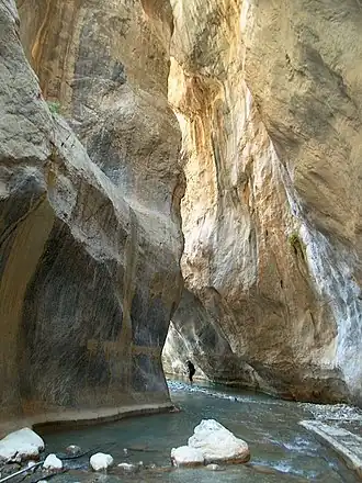 The Sarakina Gorge (also Myrtos Canyon, after the nearby coastal village of Myrtos) is a canyon in the southeastern part of Crete, Greece. It is located about 15 km west of Ierapetra and a few kilometres upcountry of Myrtos, near the small village of Mithi.