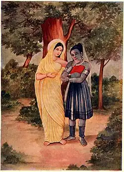 In the Hindu epic Ramayana, Sarama (Sanskrit: सरमा, Saramā) is the wife of Vibhishana, the brother of Ravana, the demon (rakshasa) king of Lanka.[1] Sometimes, she is described as a rakshasi (demoness),[2] at other times, she is said to have gandharva (celestial dancers) lineage. All accounts agree that Sarama was friendly to Sita, the consort of Rama (the prince of Ayodhya and an avatar of the god Vishnu), who was kidnapped by Ravana and imprisoned in Lanka. Like her husband who sides with Rama in the war against Ravana, Sarama is kind to Sita and aids Rama. Sarama and Vibhishana had a daughter called Trijata.