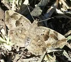 The wingspan is 36–38 mm (1.4–1.5 in) for males and 38–40 mm (1.5–1.6 in) for females. The upper surface of the wings are variegated brown and grey.