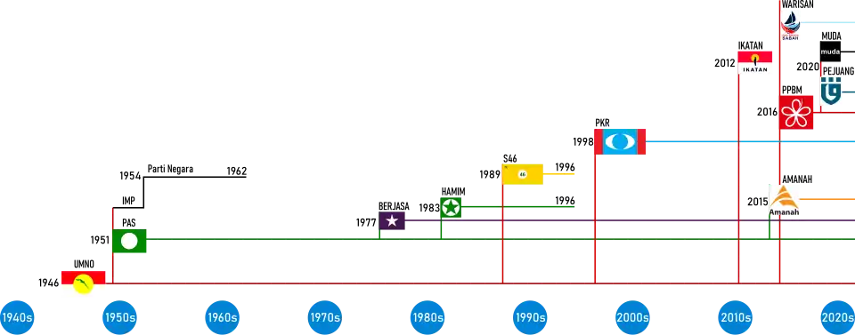 BERSEKUTU | 1998–2010 | Established by former Sabah Chief Minister, Harris Salleh, the party contested the 1999 general election but failed to win any seats. In 2010, the party was dissolved and Harris went on to form the Sabah People's Front. |