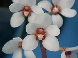 Sarcochilus hartmannii, commonly known as the large boulder orchid',[3] ravine orchid, Hartmann's sarcochilus or cliff orchid,[4] is a lithophytic orchid endemic to eastern Australia. It forms spreading clumps with between four and ten thick, channelled leaves and up to twenty five white flowers with crimson spots near the centre.