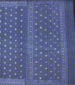 [53] Silk Ikat and cotton saris known as Patola, Pochampally, Bomkai, Khandua, Sambalpuri, Gadwal, Berhampuri, Bargarh, Jamdani, Tant, Mangalagiri, Guntur, Narayan pet, Chanderi, Maheshwari, Nuapatn, Tussar, Ilkal, Kotpad and Manipuri were worn for both festive and everyday attire.[54]Tie-dyed and block-print saris known as Bandhani, Leheria/Leheriya, Bagru, Ajrakh, Sungudi, Kota Dabu/Dabu print, Bagh and Kalamkari were traditionally worn during monsoon season.[55]
