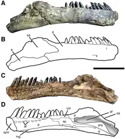 The describing authors indicated nine unique distinguishing traits, autapomorphies. The eye socket is large, equalling 40% of the length of the skull. The ascending branch of the maxilla has a complex connection with a top process of the lacrimal bone, being wedged between its outer side and inner side. The inner edge of the rear part of the ascending branch of the maxilla touches the rim of the bony nostril with a low but distinct ridge. The ascending branch of the quadratojugal has at its lower rear a tongue-shaped process overlapping the rear of the quadrate. In the braincase there are three separate exits for the nervus trigeminus. An inner vein channel connecting the infundibulum with the brains stem, is lacking. The premaxillary teeth are positioned vertically, the maxillary teeth are inclining to the front and the dentary teeth are inclining to the rear. The middle neck vertebrae have strut-like, instead of plate-shaped, ridges between the front joint processes and the vertebral centrum. A long and thin ossified tendon is running along the low side of the series of neck vertebrae and neck ribs.[3]