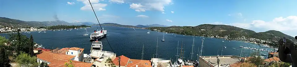 The gulf includes the islands of Aegina, Salamis, and Poros along with smaller islands of Patroklos and Fleves. The port of Piraeus, Athens' port, lies on the northeastern edge of the gulf. The site of the former Ellinikon International Airport is also in the northeast.