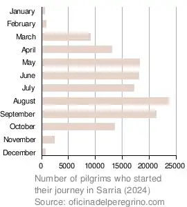 Sarria lies on the French Way of the Camino de Santiago. In 2024 over 150,000 pilgrims headed from this town in the direction of Santiago de Compostela. Out of all pilgrims on the French Way about 64% started in Sarria. Most people started their pilgrimage here in August and September.[2]
