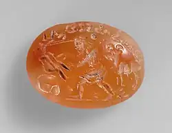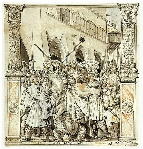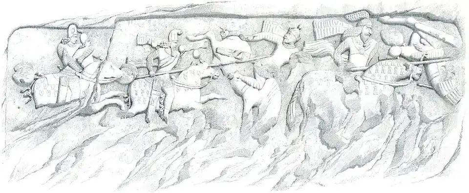 Shapur soon resumed the war, defeated the Romans at Barbalissos (253), and then probably took and plundered Antioch.[33][34] Roman counter-attacks under the emperor Valerian ended in disaster when the Roman army was defeated and besieged at Edessa and Valerian was captured by Shapur, remaining his prisoner for the rest of his life. Shapur celebrated his victory by carving the impressive rock reliefs in Naqsh-e Rostam and Bishapur, as well as a monumental inscription in Persian and Greek in the vicinity of Persepolis. He exploited his success by advancing into Anatolia (260), but withdrew in disarray after defeats at the hands of the Romans and their Palmyrene ally Odaenathus, suffering the capture of his harem and the loss of all the Roman territories he had occupied.[35][36] In 262 CE, Shapur attacked the Kushans destroying the cities of Begram and Taxila.[37]
