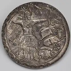 and Alchono (αλχοννο) in Bactrian script on the obverse. Dated 400–440.[51]From around 370, however, towards the end of the reign of Shapur II, the Sasanians lost the control of Bactria to invaders from the north: first the Kidarites, then the Hephthalites and finally the Alchon Huns, who would follow up with an invasion of India.[52] These invaders initially issued coins based on Sasanian designs.[53] Various coins minted in Bactria and based on Sasanian designs are extant, often with busts imitating Sassanian kings Shapur II (r. 309 to 379) and Shapur III (r. 383 to 388), adding the Alchon Tamgha and the name "Alchono" in Bactrian script on the obverse, and with attendants to a fire altar on the reverse.[54]