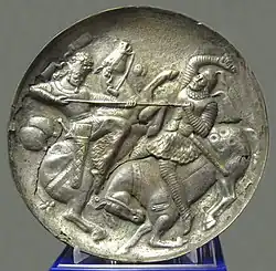 Bahram V's son Yazdegerd II (438–457) was in some ways a moderate ruler, but, in contrast to Yazdegerd I, he practised a harsh policy towards minority religions, particularly Christianity.[59] However, at the Battle of Avarayr in 451, the Armenian subjects led by Vardan Mamikonian reaffirmed Armenia's right to profess Christianity freely.[60][61] This was to be later confirmed by the Nvarsak Treaty (484).
