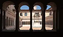 - The Romanesque cloister (1229), commissioned by abbot Angelo and executed by the Roman stonemason Pietro de Maria. it has a rectangular plan with 58 arcades supported by a double order of 128 small helicoidal columns with capitals having lily decorations and mosaic tassels. In 1340 a large central cistern was added, followed by a pit in 1623. The cloister is also home to a fresco depicting the Virgin Enthroned with Child (14th century).