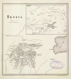 In the late 19th century, Sasun was made a part of the Bitlis vilayet, with most of it falling under the Sasun kaza in the sanjak of Mush and smaller sections going to the sanjaks of Genç and Siirt.[33] In the 1880s, clashes occurred in Sasun between Armenian militiamen and Ottoman gendarmes.[33] The Sasun Armenians were led by Vardan Goloshian, an Armenian revolutionary from Tiflis.[33] The escalation of Armenian-Kurdish violence in Sasun in the early 1890s and the Ottoman intervention that culminated in the 1894 Sasun rebellion and massacre has been explained variously. Many sources view these events as a result of deliberate provocations by the Ottoman authorities, who sought to bring Sasun to heel as a potential hotbed for rebellion.[24][30][34] In 1891–92, the hamidiye irregular cavalry units were sent by the Ottoman authorities to attack Sasun, but were fought off by Armenian forces.[33] The famous Armenian fedayi Arabo came to prominence in these battles.[33] Several Armenian revolutionaries traveled to Sasun to join in the armed resistance. Among the leaders of the Armenian militias were Mihran Damadian, Hampartsoum Boyadjian, Hrayr Dzhoghk, Aghbiur Serob, Kevork Chavush and Krko (Krikor Moseyan).[33] Unable to bring Sasun to submission with police forces and Kurdish irregulars in 1893, the Ottoman authorities sent the regular army to surround Sasun and declared martial law in the area.[33] The Ottoman Fourth Army under the command of Zeki Pasha was charged with pacifying Sasun.[33] After several months of fighting, the outnumbered Armenian forces under the leadership of Hampartsoum Boyadjian were defeated and the inhabitants of a number of villages in Sasun were massacred.[33] The rebellion and massacre at Sasun is regarded as the beginning of the Hamidian massacres and provoked an international outcry.[35]