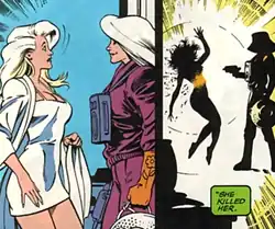 Still posing as the Earth-616's Courtney Ross, she has joined the Hellfire Club as its White Queen, with Viper, a former HYDRA assassin, as her self-proclaimed "White Princess" and bodyguard.[23] Someone claiming to be Courtney Ross has been seen in issues of Uncanny X-Men during the House of M crossover, as well as in the early issues of New Excalibur. Upon meeting Captain Britain during the House of M event, she was attacked and was accused of being her impostor, Sat-Yr-9, but upon revealing that she did not possess a tattoo on her thigh, was believed to be the true Courtney Ross (possibly resurrected as a side-effect of House of M).[24] The Official Handbook of the Marvel Universe does not confirm if this was the true Courtney Ross, resurrected, or Sat-Yr-9 continuing to pose as her.[13] She is then shown sacrificing herself to save Captain Britain from an attack by the Omega Sentinel.[25] After the events of House of M, Sat-Yr-9 returns. She tries to convince Captain Britain that she is the real Courtney Ross, although he is still unconvinced.[26] Later on, he has warmed up to the idea of Courtney actually being herself again, referring to her as Courtney and confiding in her.[27]