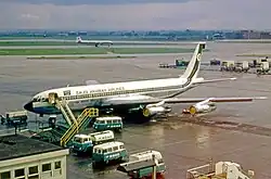 In 1962, the airline took delivery of two Boeing 720s, becoming the fourth Middle Eastern airline to fly jet aircraft after Middle East Airlines and Cyprus Airways with the de Havilland Comet in 1960 and El Al with the Boeing 707 in 1961.[10] On 19 February 1963, the airline became a registered company, with King Faisal of Saudi Arabia signing the papers that declared Saudia a fully independent company. DC-6s and Boeing 707s were later bought, and the airline joined the AACO, the Arab Air Carriers' Organization. Services were started to Frankfurt, Geneva, Khartoum, London, Mumbai, Rabat, Sharjah, Tehran, Tripoli, and Tunis.