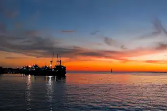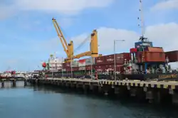 Public transportation in the town consists of angkot that have regular tracks regulated by the regency government.[12] The town is served by the small port of Saumlaki, which has regular routes to neighbouring towns such as Dobo in Aru Islands Regency.[13] In 2021, the Indonesian Navy built a new naval base in the town which includes bigger port facilities capable of handling ships of to 12,000GT.[14] The town was previously served by Olilit Airport, which was later replaced with the bigger Mathilda Batlayeri Airport.[15] The airport served around 24,000 passengers in 2020, both in departures and arrivals. The town is also connected through the Sea Toll Program for passengers and movement of basic goods.[16]