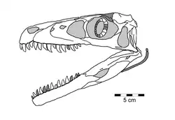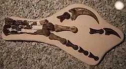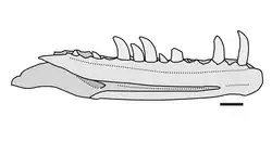 Aase Roland Jacobsen published a description of a Saurornitholestes dentary in 2001.[24] The dentary is about 12 cm long and preserves fifteen tooth positions, of which only ten preserve teeth.[25] Three toothmarks were visible on the inner "lingual" surface of the dentary.[25] Two of the three marks are series of grooves made by the serrations on the maker's teeth.[25] The striations are between 0.37 mm and 0.40 mm thick with cuboidal cross-sections.[26]