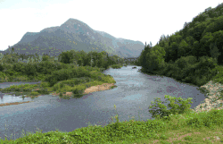 The "Les Loups" trail in the "Sautauriski Mountain" is the most popular with hikers in the Jacques-Cartier National Park. Very well laid out, this marked trail is under forest cover. This trail has an elevation of 452 metres (1,483 ft). The rather steep climb for the first portion of the route. Halfway, the path arrives at a first lookout nestled at an altitude of 574 metres (1,883 ft). This belvedere presents a magnificent panorama on the vertiginous walls bordering the Jacques-Cartier river on the southwest face of the mountain. The next segment of the ascent is done more gradually over 2.7 kilometres (1.7 mi), that is to the second point of view. Then, the path becomes narrower and more rugged along the sides of the mountain.