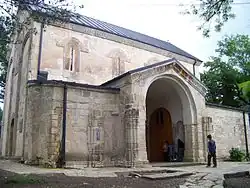The iconostasis is a high structure, with a notched cornice and divided into two distinct parts; the lower formerly took the form of a compact wall, made of slabs of hewn stone, with a royal door in the middle, but later doors were made to the north and the south. The upper part, made of stucco, consists of three cinquefoil arches with cusps in the form of clover leaves, resting on four carved columns. The interior of the Savane church is whitewashed, and there is no trace of paintings. The church is lit with five windows, one each on the east and west, and three on the south. The doors are to the west and south. Later—no earlier than the 14th–15th century—a porch was built in front of the southern door with complex, engaged columns, set in a cluster, the capitals and bases carved; probably at a later date still, separate chambers were added to the porch on the east and west.[2]