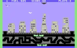 Another game element is a plane passing over the city from time to time dropping fuel canisters which the player has to catch to refuel his airplane.