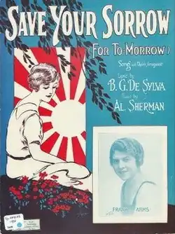 "Save Your Sorrow (For Tomorrow)" is a popular song first published in 1925 written by Tin Pan Alley tunesmiths, Al Sherman and B.G.DeSylva. The publisher was Shapiro, Bernstein & Company, based in New York City. Songwriter, Al Sherman's son, Robert (a future Academy Award winning songwriter) was just born and Al did not have the money to pay the hospital bill. Upon arriving home from the hospital, Al discovered the first royalty check from "Save Your Sorrow" in his mailbox and was therefore able to pay the bill.[1]