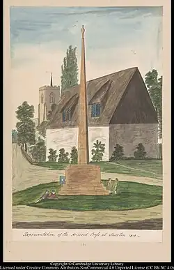 Until 1815 the village of Sawston had an ancient cross, possibly erected by the Knights Templar. The cross had many purposes, even as a location where public officers administered justice during the 13th century. It survived the rage of the Puritans in the civil wars, but was torn down between the summer of 1815 and autumn of 1816, along with the surrounding amphitheatre-like enclosure, the stocks and ancient sycamore tree, and sold by greedy village elders to make way for redevelopment. William Hone's Table-book includes a contributor's description when he stumbled across the villagers discussing whether or not to tear down the cross.[8] A poem comparing Sawstonites to the Jews, which would today appear to be antisemitic, was subsequently published in the 1827 journal:
