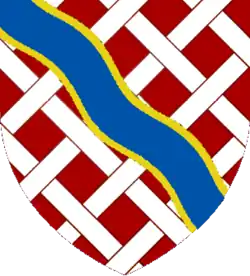 | Shield | Gules fretty Argent a Bend wavy Azure fimbriated Or. |