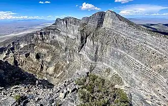 Sawtooth Mountain is part of the House Range which is a subrange of the Great Basin Ranges. The remote massif is set within the Notch Peak Wilderness Study Area on land administered by the Bureau of Land Management.[2] Slopes of the mountain are covered with pinyon–juniper, sagebrush-horsebrush, white fir, bristlecone pine, ponderosa pine, and aspen.[4] Topographic relief is significant as the summit rises over 4,000 feet (1,200 meters) above Tule Valley in two miles. This landform's toponym was officially adopted in 1961 by the U.S. Board on Geographic Names.[1]