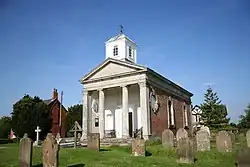St Helens parish church is a Grade I listed building, constructed in 1775 as an ashlar-faced red-brick mortuary chapel. The chapel, later a church, had been attributed to Carr of York (who constructed the nearby Norton Place) but no evidence to prove this has been found. It has been assumed that the Lumbys, who often worked with Carr, might have been the architects. There are of four wall plaques in white marble and Greek style, dating from 1832 to 1856, to the Earl of Scarborough, for whom the chapel was built.[2]