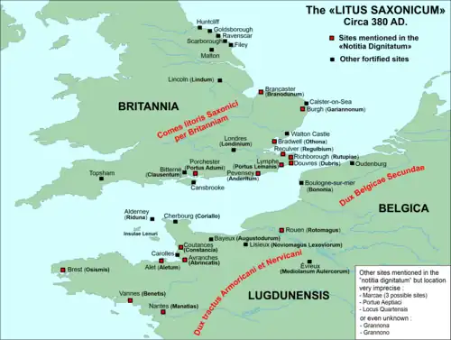 The only contemporary reference we possess that mentions the name "Saxon Shore" comes in the late 4th-century Notitia Dignitatum, which lists its commander, the Comes Litoris Saxonici per Britanniam ("Count of the Saxon Shore in Britain"), and gives the names of the sites under his command and their respective complements of military personnel.[1][2] However, due to the absence of further evidence, theories have varied among scholars as to the exact meaning of the name, and also the nature and purpose of the chain of forts it refers to.