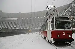 The station's constructions include the dam, a power plant building located near the dam, and an additional spillway which is under construction. The arch-gravity dam is 242 metres (794 ft) high. It has a crest length of 1,066 metres (3,497 ft), crest width of 25 metres (82 ft), base width of 105.7 metres (347 ft) and maximum head of 220 metres (720 ft). It consists of a solid left-bank dam 246.1 metres (807 ft) long, a power dam 331.8 metres (1,089 ft) long, a spillway dam 189.6 metres (622 ft) long and a solid right-bank dam 298.5 metres (979 ft) long.[9] It is by far the larger of only two gravity-arch dams in Russia. Water pressure for the dam is approximately 30 million tons, of which 60% is neutralized by the dam's own weight and 40% is carried to rock on the bank[10]