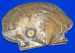 The model scallop shell consists of two similarly shaped valves with a straight hinge line along the top, devoid of teeth, and producing a pair of flat wings or "ears" (sometimes called "auricles", though this is also the term for two chambers in its heart) on either side of its midpoint, a feature which is unique to and apparent in all adult scallops.[7] These ears may be of similar size and shape, or the anterior ear may be somewhat larger (the posterior ear is never larger than the anterior one, an important feature for distinguishing which valve is which). As is the case in almost all bivalves, a series of lines and/or growth rings originates at the center of the hinge, at a spot called the "beak" surrounded by a generally raised area called the "umbo". These growth rings increase in size downwards until they reach the curved ventral edge of the shell. The shells of most scallops are streamlined to facilitate ease of movement during swimming at some point in their lifecycles, while also providing protection from predators. Scallops with ridged valves have the advantage of the architectural strength provided by these ridges called "ribs", although the ribs are somewhat costly in weight and mass. A unique feature of the scallop family is the presence, at some point during the animal's lifecycle, of a distinctive and taxonomically important shell feature, a comb-like structure called a ctenolium located on the anterior edge of the right valve next to the valve's byssal notch. Though many scallops lose this feature as they become free-swimming adults, all scallops have a ctenolium at some point during their lives, and no other bivalve has an analogous shell feature. The ctenolium is found in modern scallops only; both putative ancestors of modern scallops, the entoliids and the Aviculopectinidae, did not possess it.[8]