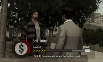"Cop heat" and "gang heat" are two meters that are active at all times during the game. Cop heat determines the rate of interest at banks, and gang heat determines the price of cocaine; the more heat, the less Tony can charge. If Tony, or any of his associates, engages in a lot of public violence, cop heat will rise, and the police will arrive, pursuing Tony. Cop heat can be lowered with bribes, and gang heat can be lowered by intimidating other gangs.[9] If Tony continues to commit crimes in public, cop heat can rise to the point where he enters "You're fucked" mode, in which he cannot escape from the police alive.[18] A "golf swing"-style minigame, where the player must attempt to stop the meter in a certain zone, is used to control negotiating drug deals, intimidating other gangs, and bribing cops.[19]