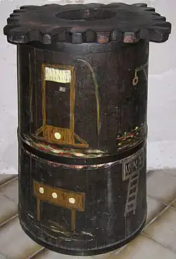 A Schandmantel or Schandtonne (German, "coat of shame" or "barrel of shame"), sometimes also Spanish coat, is a torture device which came into use in the 13th century. Schandmantels were fashioned from wood and sometimes lined with sheet metal. Victims were made to wear this device in public where they would be insulted, humiliated and have rotten vegetables thrown at them. The Schandmantel was mostly used as punishment for poachers and prostitutes.