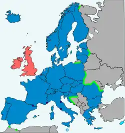 Of the 27 EU member states, 25 are members of the Schengen Area. Cyprus and Ireland are the only EU member states that are not part of the Schengen Area. Cyprus aims to become part of the Schengen Area by 2026.[2][3] The country is committed by treaty to join in the future, but its participation has been complicated due to the occupation of Northern Cyprus by Turkey since 1974. Ireland maintains an opt-out and operates its own visa policy.