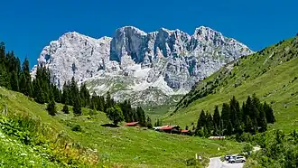 ![]() Schijenflue southern face (centre) as seen from St. Antönien. The Wiss Platte is the left summit | |