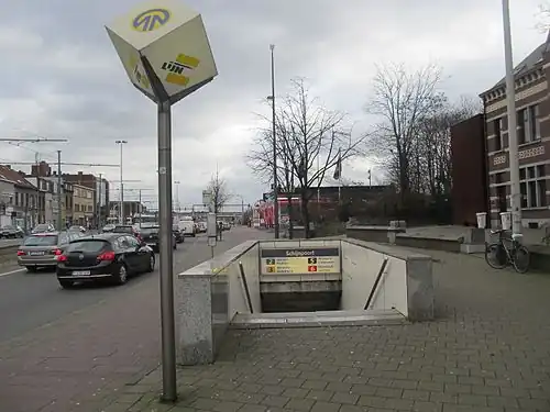 Schijnpoort is an underground station in the Antwerp premetro network. The station was named after the Schijnpoort gate, part of the Brialmont fortifications, which was demolished in 1970 when constructing the R1 ring road.[1] It was opened in 1996 as part of the northern premetro axis and was originally only served by tram route 3. Currently, it is also serviced by tram route 5 (since 2006),[2] tram route 6 (since 2007)[3] and tram route 2 (since 2012).[4]