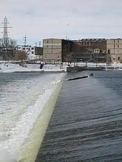 The building's long south facade stretches ten bays as the ground slopes toward the river. All of the south bays feature one over one single-hung sash windows on each story except for bays four, seven and eight, which are windowless. The south facade also features piers with iron buttresses as well as a third bay dock door.[4]