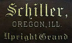 The Schiller Piano Company was founded around 1890 at the northwest corner of Oregon's Second and Washington Streets.[2] Its creation was financed by Oregon resident F.G. Jones. The first president of the company, Jones was not active in the company's management until 1895 when he reportedly left his well-established mercantile business to take an active position at the piano company as general manager and president of the factory. Sources conflict as to whether Jones actually left his mercantile interests behind, which included work as the president of the Oregon Electric Light and Power Company and Oregon Machine and Foundry. In addition the Schiller Company owned an interest in the Power Company and two Jones sons, George H. and Edgar B., held management positions with the firm.[2]