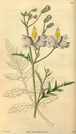 Known as Poor Man's Orchid, this plant grows to a height of 30 to 50 cm, glandulous-pubescent, with pinnatisect leaves up to 8 cm long. The flowers can be violet, pink, orange or white, with the tube approximately 1 cm long and the superior labia greater than 2 cm in length, being longer than the inferior one. The fruit is a 1 cm long ellipsoid boll. Native to Chile they are also cultivated as ornamentals. The plants flowers in summer.[4][6][9]