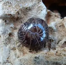 It has a convex body, and is capable of volvation (rolling into a ball) without leaving fissures. It has small eyes with several ocelli. Its telson is triangular and its uropods are similar to those of Armadillidium.[2][3] The first joint of the antenna is remarkably small,[4] being only about half as long as the second.[3]