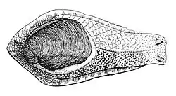 The shell is small, rudimentary, auriform (ear-shaped) and is situated far back on the animal. The shell is incapable of containing the body, and is reduced to the function of a shield for the lungs and heart. The shell is paucispiral, and is nacreous within. The columella is excavated into a pit for the reception of the shell-muscle.[1]