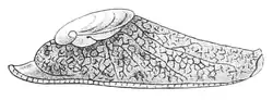 The length of specimen contracted in alcohol is 20 mm, the height and breadth are 9 mm. Behind the shell, which is situated upon the hinder half of the body, the tail projects slightly. The end of the tail is flat, has no caudal mucous pit, and is bluntly pointed. The margin of the foot is produced into a slight flange. A pair of grooves running along the median line from the mantle to the muzzle define a row of small tubercles. Right and left, between this median line and the foot-edge, 2 indistinct grooves can be traced from the mantle to the lips. Posterior to these, the surface is divided into tubercles by small irregular grooves meandering outwards and downwards. The mantle has an even margin, with 2 small lappets on the under-side; the right proceeds forward from a little behind the respiratory pore (pneumostome), extends to almost one-third of the length of the mantle-margin, and forms a narrow fold; the left is minute, simply a rudiment, and in some specimens it is difficult to detect. The sole of the foot is without a defined median area. Two small labial tentacles are present. The color is reddish-brown, splashed with black, and darkest above. The mantle and sole are ashy-yellow.[7]
