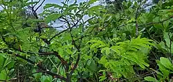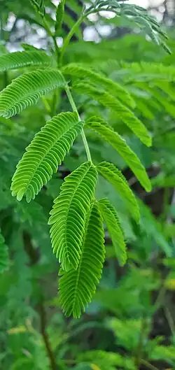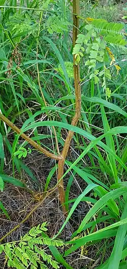 This plant is a large shrub generally growing up to 2 meters tall, sometimes becoming treelike and reaching 6 meters. The leaves are made up of a few pairs of pinnae, each of which is lined with several pairs of leaflets up to a centimeter long. The inflorescence is a small globular cluster of tiny white five-petaled flowers which may be bisexual or functionally male. The fruit is a hard, flattened, brown or black pod up to 11 centimeters long.[1]