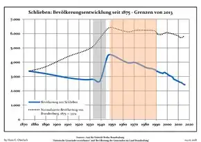 Development of Population since 1875 within the Current Boundaries (Blue Line: Population; Dotted Line: Comparison to Population Development of Brandenburg state; Grey Background: Time of Nazi rule; Red Background: Time of Communist rule)