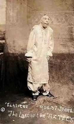 Schlitzie's true birth date, name, location and parents are unknown; the information on his death certificate and gravesite indicate that he was born on September 10, 1901, in The Bronx, New York,[2] though some sources have claimed that he was born in Santa Fe, New Mexico.[3] Claims that he was born in Yucatán, Mexico, are mistaken reflections of Schlitzie's occasional fanciful billing as "Maggie, last of the Aztec Children".[3] Information about Schlitzie's identity at birth may never be known, the information having been lost as he was handed off to various carnivals in a long line of mostly informal guardianships throughout his career.
