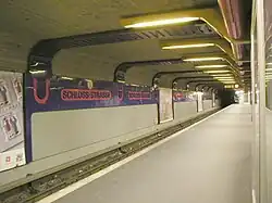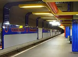 With its visible concrete walls partially covered by dark blue, orange and yellow plastic panels, Schloßstraße is an example of the 1970s pop-art design. Opened in 1974 by Schüler/Witte, it was planned to be a transfer station between U9 and the to-be-built U10. However, there is no current plan to establish the U10.[1]